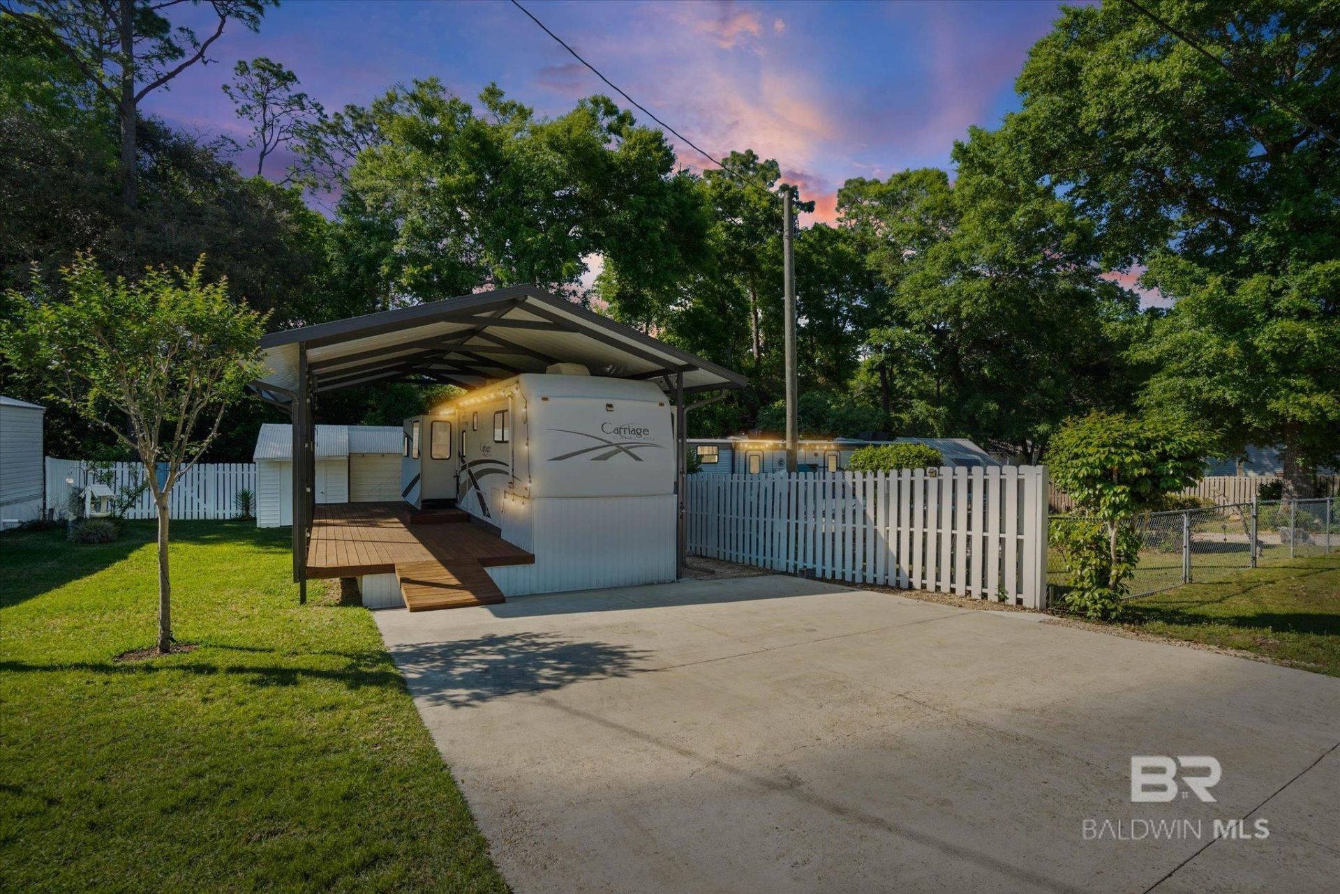 Turn-key RV lot in the highly sought-after Spanish Cove subdivision! This 35x80 lot comes fully loaded and ready to enjoy from day one. A 2003 Carriage Lite 36' fifth wheel conveys with the property, sheltered by a custom metal carport cover with a composite deck ? perfect for outdoor living. The concrete driveway, white picket fencing with gated entry, and well-maintained lawn give this lot outstanding curb appeal, as the professional photos show. A 10.5x24 storage/bunkhouse building rounds out the package ? one-third dedicated storage, two-thirds finished bunkhouse with bunk beds, A/C, and heat, ideal for extra guests. Electric, water, and sewer are all connected. Sold as-is.Spanish Cove amenities are second to none for a $75/month HOA ? year-round swimming pool, 24-hour security, clubhouse, fishing pier, tennis court, fitness room, and laundry facility. Just minutes from beautiful Perdido Bay and the Lillian public boat launch. Whether you're looking for a weekend getaway, a fishing base camp, or a full-time retreat, this property checks every box. Priced at $129,000. Buyer to verify all information during due diligence.
